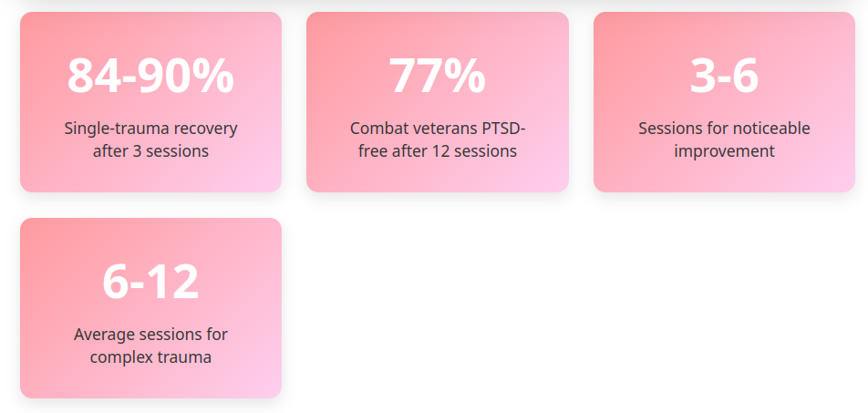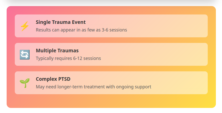 Some clients notice improvements after just a few sessions, particularly when addressing a single traumatic event. For complex trauma or multiple distressing experiences, treatment typically ranges from 6 to 12 sessions, though some individuals may benefit from longer-term therapy. Many clients report feeling noticeably better within 3 to 6 sessions.
